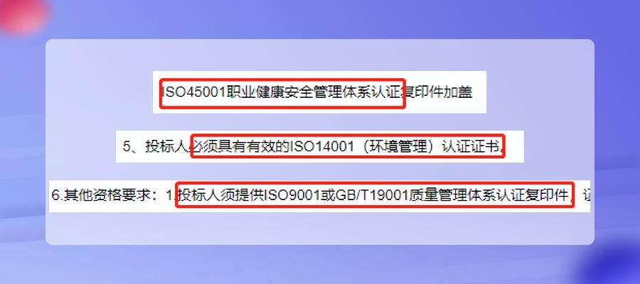 第一,三体系认证可以帮助企业招投标入围,尤其是其中的ISO9001认证。市场的竞争主要是价格和品质的竞争,通过三体系认证的标准化管理流程可以一定程度上提升产品的品质,在招投标中脱颖而出。而且大部分招标方都会在招标书上写明投标企业必须提供有效的三体系证书。